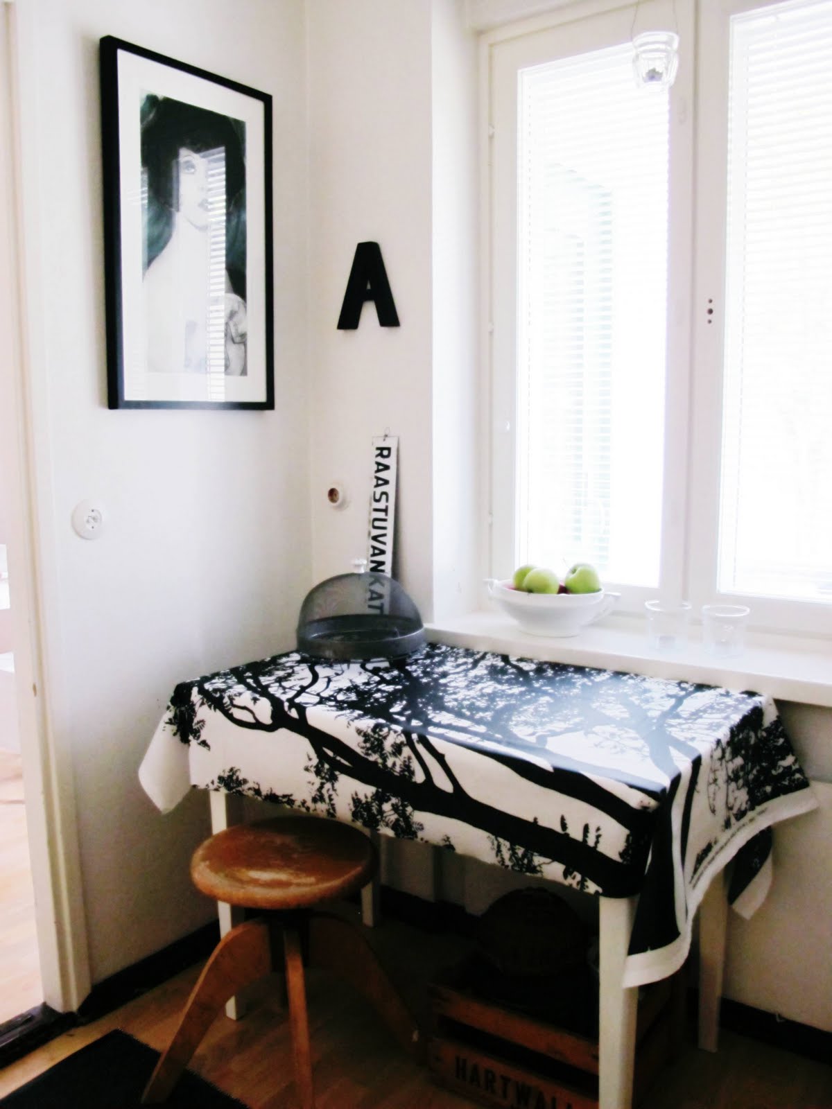 Hello! I´m so busy at the moment that all the inspiration that I´m having does not reach my blog right now. It is a pity, so I much get my act together soon 🙂 Right now I´m in a more modern and simple mood. I bought this table to my tiny kitchen aswell as the industrial chair from one of the summer flea markets. The wax tablecloth is from Marimekko. I´m still waiting for two Alvar Aalto chairs that will be painted black.