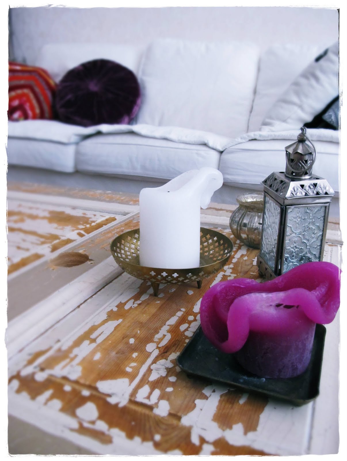 Olohuoneen isoin muutos on sohvapöytä, joka syntyi yhdistelemällä kaikkea jo ennestään meiltä löytyvää eli vanhasta ovesta tuli kansi ja kahdesta pullokorista runko. Keskellä on kolmas kori, mutta se ei tue pöytää. Toimii vain lehtikorina. Iso sohvapöytä oli tosi toivottu muutos, sillä kaipaan tähän paljon tilaa teekupeille, kynttilöille yms! Puhumattakaan lukemattomista mahdollisuuksista muuttaa ”sisustusta” tässä 🙂 Nyt pöydällä on kokoelma kynttilöitä, kaikki kirppiksiltä. Keväisiä päiviä!