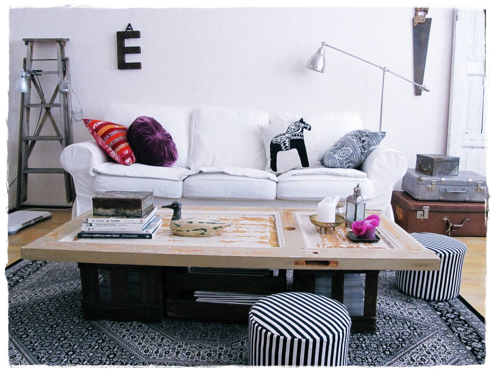 Aivan ihana olohuone. Oispa mullakin samanlainen. Taytynee alkaa metsastamaan vanhaa ovea 🙂 (ja isompaa olohuonetta… :D)