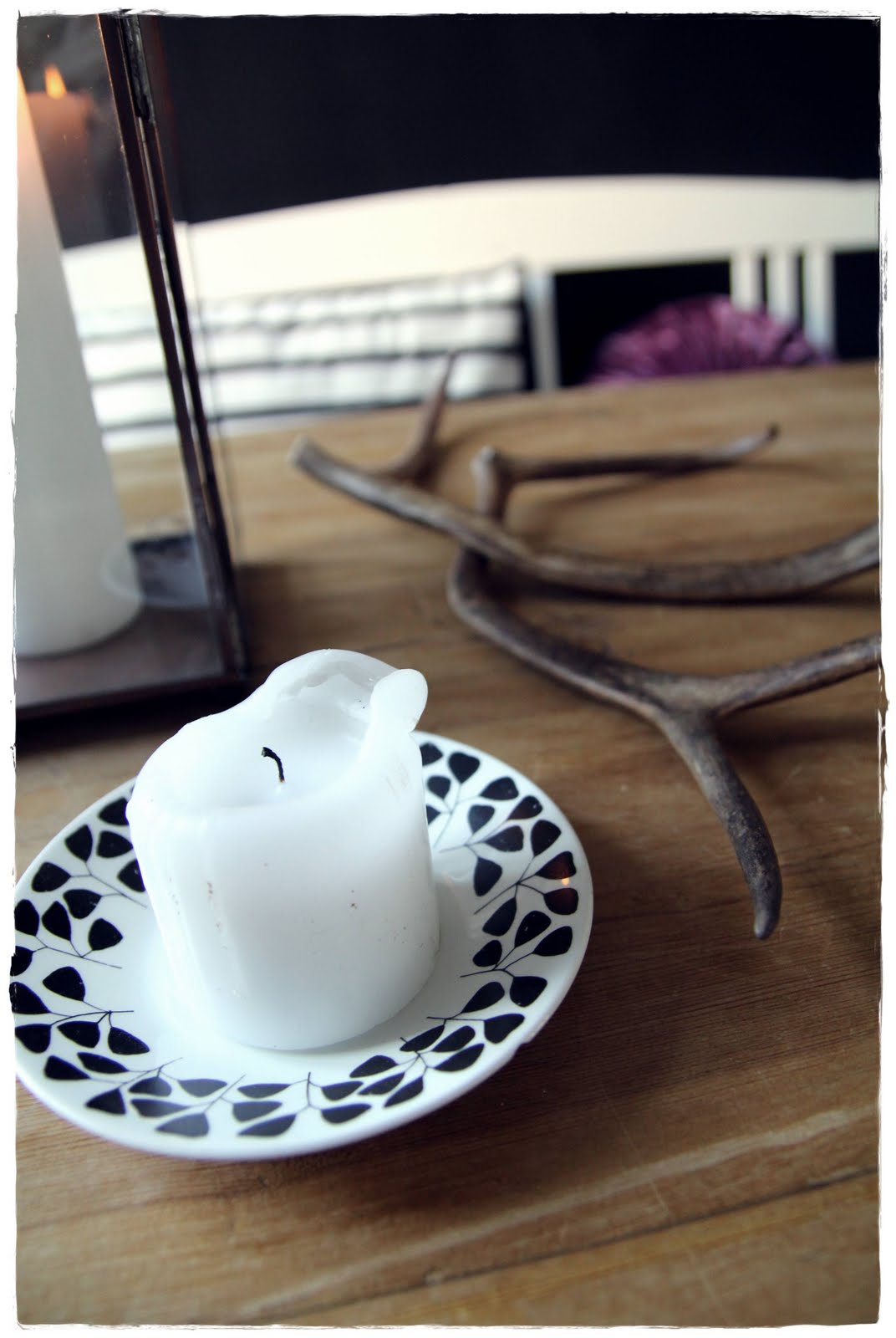 Loman alkua päätin juhlia uudella lyhdyllä – Tine K:lla olen nähnyt tällaisia siroja lasilyhtyjä eli sellainen oli alunperin kiikarissa. Niitä ei kuitenkaan ollut eli poistuin tämän kuparin värisen Nordalin lyhdyn kanssa ja taitaa se sopia paremmin ruokapöydälle. Kirppikseltä löytyi samana päivänä vielä ihan nappiin kuvan aito sarvi-pari kolmella eurolla! Kynttilän aluslautanen on Arabiaa, säästin sen miehen mummon tavaroista. Näitä kun löytyisi jostain lisää… sattuisiko joku muuten tietämään sarjan nimen?