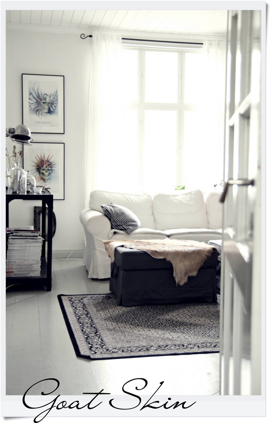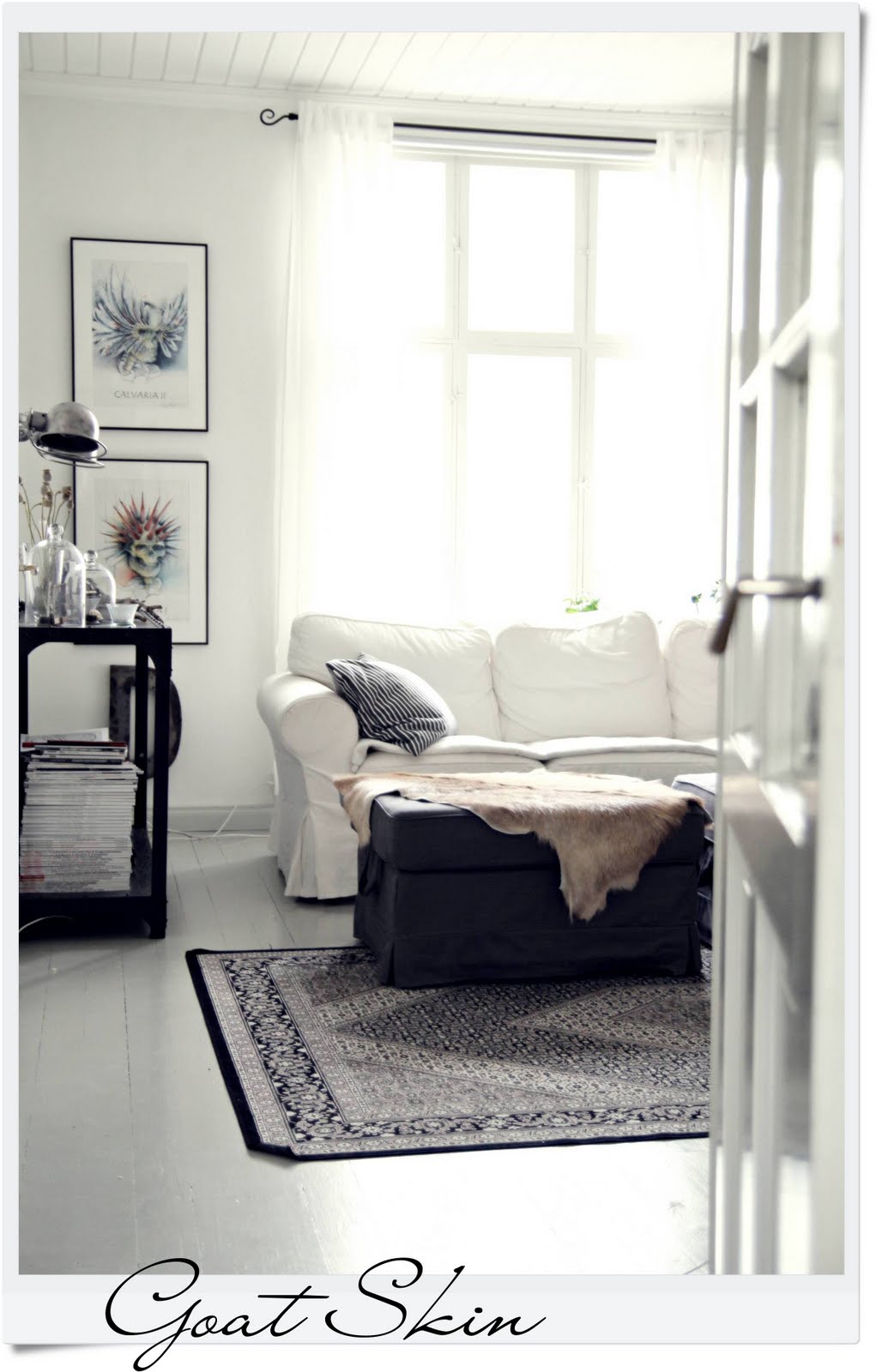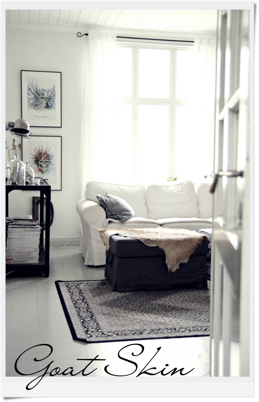 I´m a very happy owner of these two goat skins that I bought last weekend. I would like to have them everywhere, but at the moment the other is here in the living room and the other in our kitchen bench. They would be very nice to have on the floor also… I guess I´ll try some day…