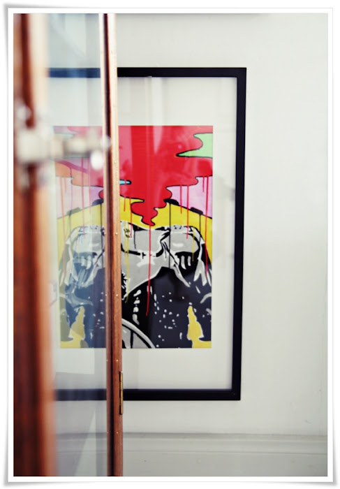 I finally got to shoot this Robo art print that I won some time ago in a blog giveaway. Lucky me 🙂 At the moment the placement is not the best, but I kind of like it here in the middle of this bedroom mess. Work table is a DIY project. Rest is vintage or 2nd hand. What I´m still missing is that black and white carpet…