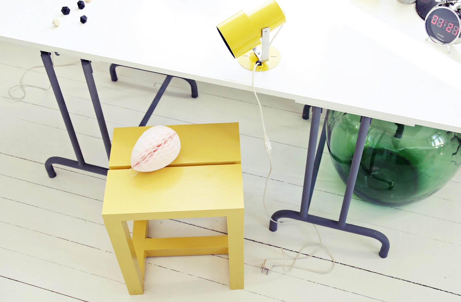 My sailor is the best. He made two wooden stools for me just like that! I painted one with yellow and the other with white. Guess which one is my favorite? 🙂 Like candy I think! As well as the retro spotlamp that I found from flea market on Friday. It became like new after some washing. Have a lovely Sunday folks!