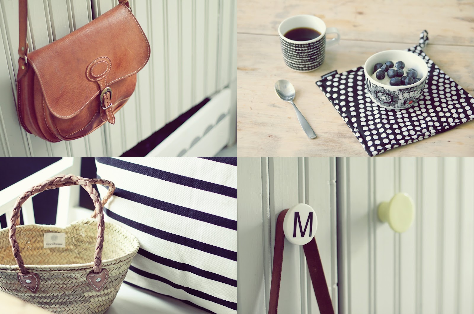About the pics: the brown leather saddle bag is a flea find for 2 eur, other bag by Tine K. and the porcelain door knobs from Copenhagen. Suitable for a rainy day collage.