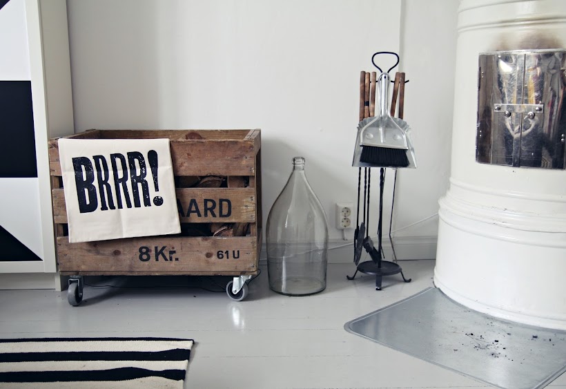 Puulaatikko on ostettu huutokaupasta, ilmeisesti jonain kuljetuskonttina käytetty joskus. Lisättiin siihen kylläkin itse noi pyörät (Clas Ohlsonilta saa). Voisin kuvitella että mustan tekstin pystyis melko hyvin itse laittamaan, jos siis tekstitystä kaipaa 😉 Nää on ihan huiput (toinen makkarissa), kun pelkästään yhteen menee kottikärryllinen puita!