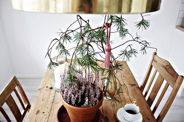 Tänä vuonna ei oo jouluinspiraatiosta pulaa, siitä pitää moni bloggaaja huolen. Näihin kuviin jämähdin silti enemmän kuin hetkeksi, sillä tyylittely on ihan huimaa! Oon pitkän aikaa ollut kyllästymisen partaalla meidän puun värisiin keittiöntuoleihin ja puiseen ruokapöytään, mutta näistä kuvista taidan saada taas uutta ideaa. Männynoksa näyttää ainakin tosi hyvältä yhdistettynä kanervan ja kullan sävyihin, vau… Kuvat lainattu BRIGG-blogista, klik!