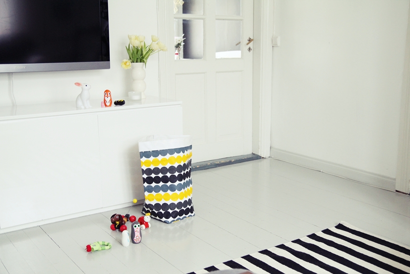 Although our miss is only one month old, she has quite a lot of stuff all over the place. A chair for babies, a gym carpet and lots of toys. It´s mainly my son who wants to show her the baby toys, cause she apparently is too small to understand anyting about toys yet. There has been toys on the sofa, on the floor and everywhere you can imagine, cause we have been missing a toy box for her stuff. But not anymore. I´m okay with toys as long as you have somewhere to put them after it´s time to go to bed. This has worked well with Paavo too – he always picks his stuff to his own room before bedtime. So it was about time to get some storage for the little one as well. No-one makes it better than Marimekko, love this new sack in spring colors!