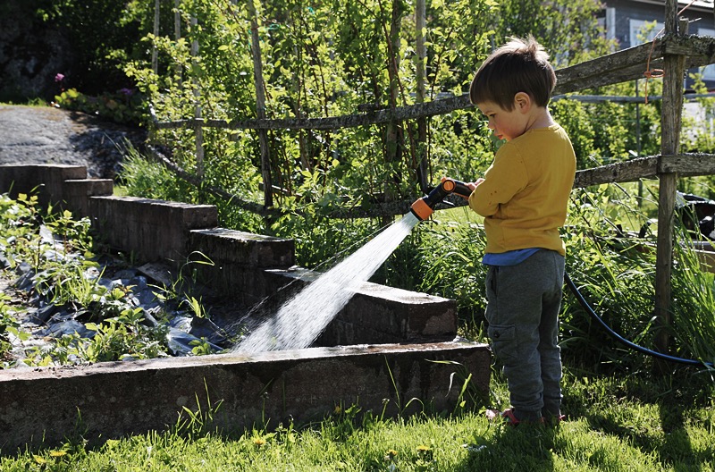 Oon viime päivinä ollut tuntitolkulla ulkona, lähinnä kitkemässä villiintyneitä rikkaruohoja, leikkaamassa nurmikkoa sekä kuivia oksia. Hommaa on aivan loputtomiin näin isossa pihassa. Pää olisi täynnä ihania suunnitelmia pihan kesyttämistä varten, mutta jotenkin tuntuu, että en ole vielä valmis antamaan sille kuin pikkusormen. Taustalla on paha aavistus, että isommalla vaihteella olisin hetken päästä täysin konkurssissa kaikkien haaveilemieni kasvien ja kivetysten kanssa. Niinpä tyydyn tässä vaiheessa vain pienempiin projekteihin kuten elvyttämään vanhaa mansikkamaata sekä kitkemään kottikärrykaupalla rikkaruohoja. Viime kesästä en todellakaan kaipaa sitä samaa kuivuutta, joka näännytti kaiken nurmikosta jopa isoihin pensaisiin asti. Tosin tänä vuonna saamme kasteluun huomattavasti apua kiitos Fiskarsin XL-kastelukelan (tuote saatu), joka ulottuu 360-säteellä myös mansikkamaan viimeiseen laitaan. Mansikat ja vadelmat olivat käytännössä ainoita kasveja, joita viime kesänä tuli kasteltua kantamalla vettä kahdella kastelukannulla. Nyt homma sujuu todella näppärästi sisäänkelautuvan tarpeeksi pitkän letkun ansiosta. Kastelupistoolin avulla veden määrää on helppo säädellä ja vesi tulee pehmeällä suihkulla vahingoittamatta kasveja. Kastelemisesta ei paljoa tarvitse mainita, kun Teukka jo on paikalla täydessä kasteluvalmiudessa! Tosin aikomuksena on edelleen kastella puutarhaa lähinnä iltaisin, jotta kaikki kosteus ei haihdu heti auringonpaisteessa.